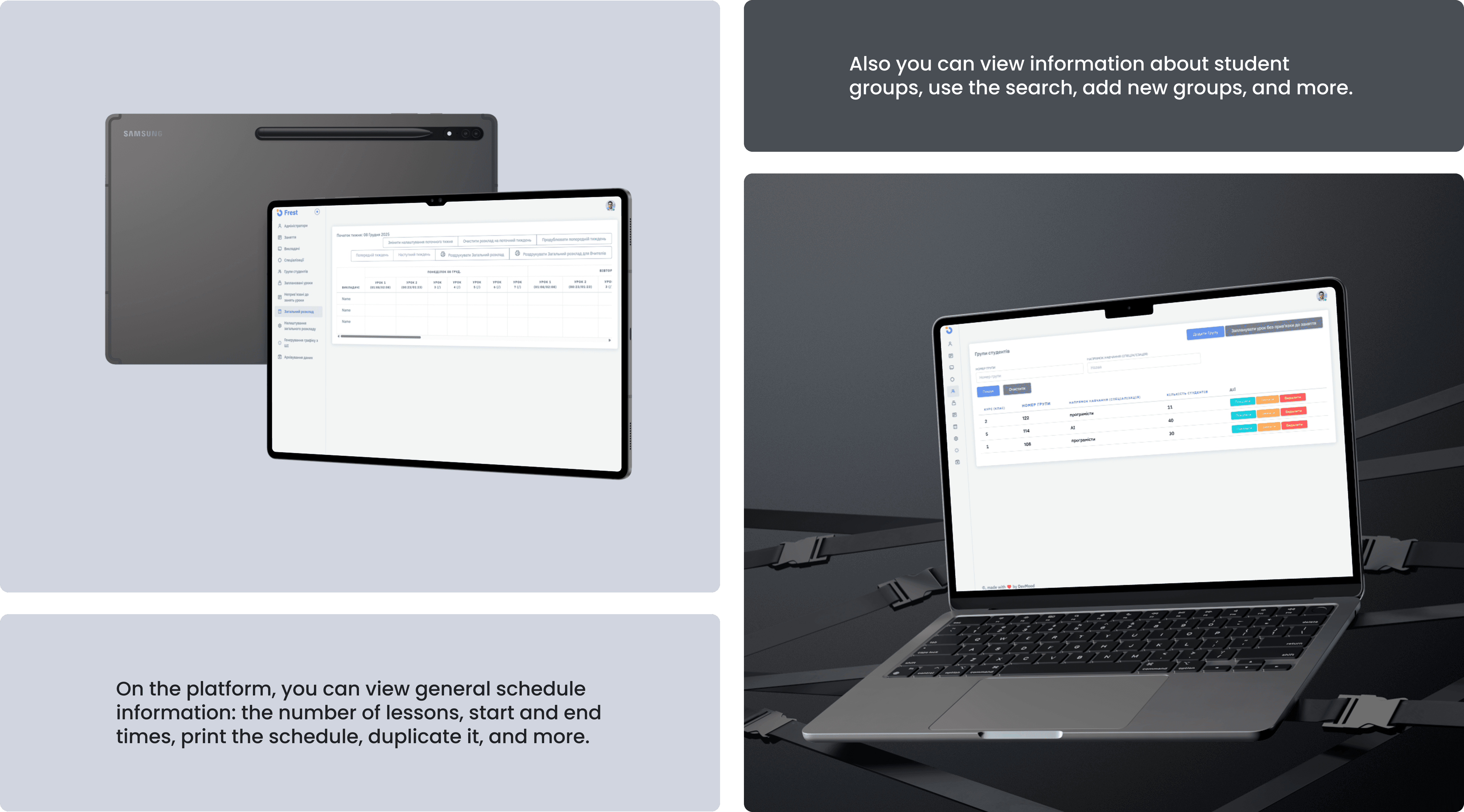 A powerful, intuitive admin panel where staff can manage teachers, groups, subjects, hours, availability, constraints. All UI built with a combination of Rails + custom JavaScript for real-time interactions.