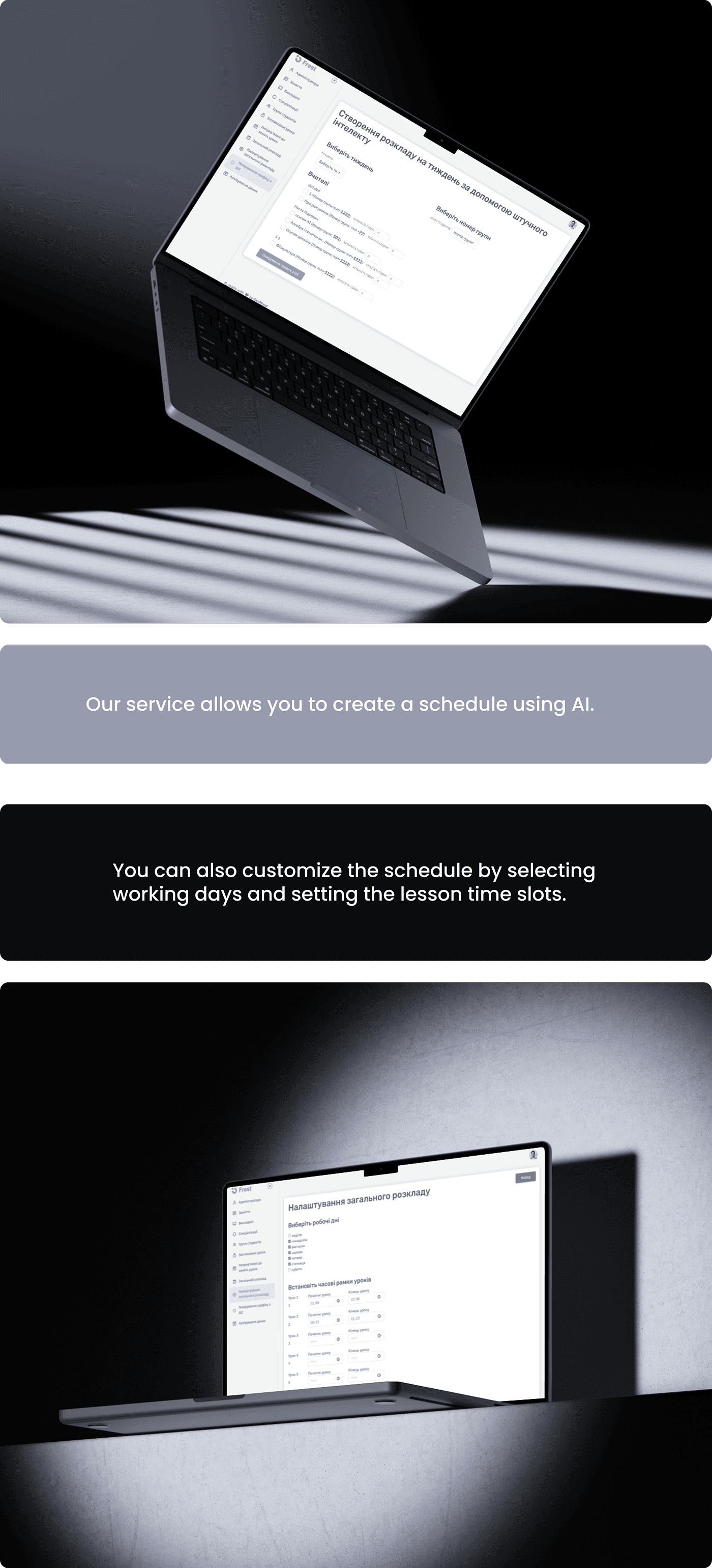 We integrated next-generation ChatGPT models optimized for large educational datasets. The system automatically generates complete timetables based on teachers, subjects, groups, time slots, room availability, weekly workload, vacations, sick leaves, custom constraints.